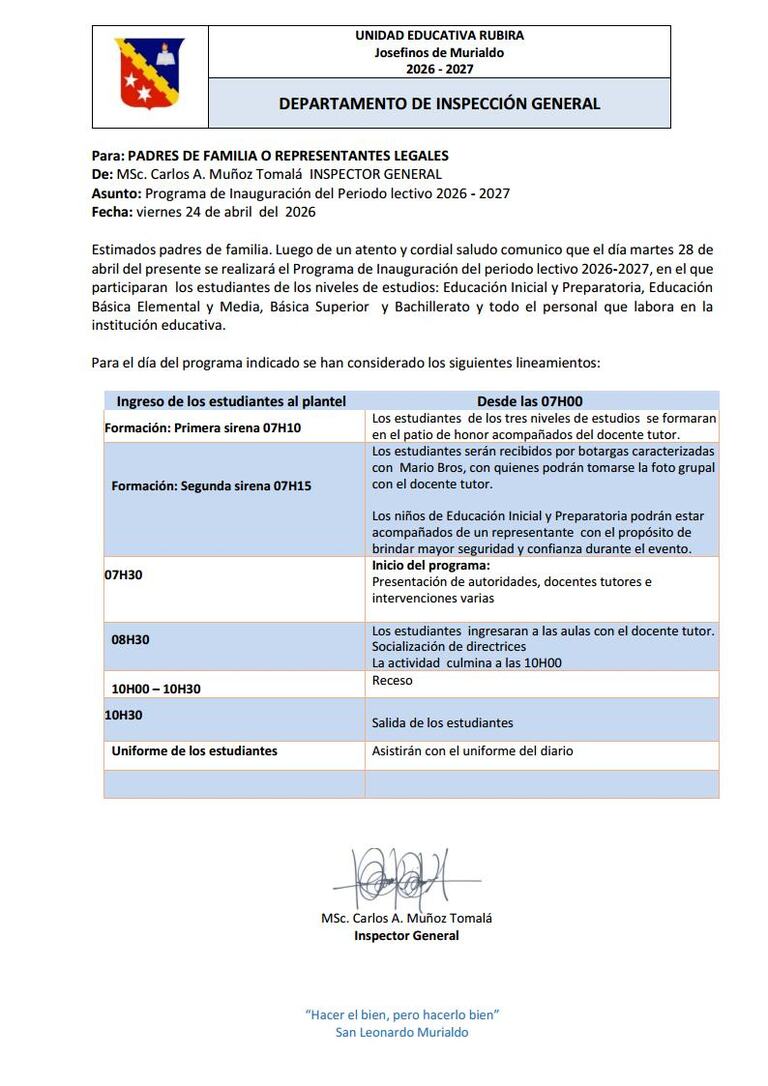 La Unidad Educativa "Rubira" es una Institución Católica. Heredamos de San Leonardo Murialdo el carisma de "Educar el corazón con el corazón", es la pedagogía del amor. Ofrecemos a nuestra colectividad la formación de niños, niñas y jóvenes basada en valores que ayudan al desarrollo de su personalidad capacitados para afrontar los retos que exige nuestra sociedad actual.